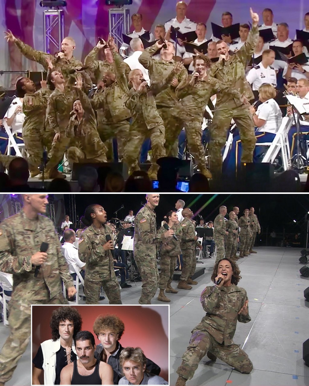 From the instant the first pounding chords of Don’t Stop Me Now rang out, the audience realized this was no ordinary performance. The soldiers weren’t here to march—they were here to rock.