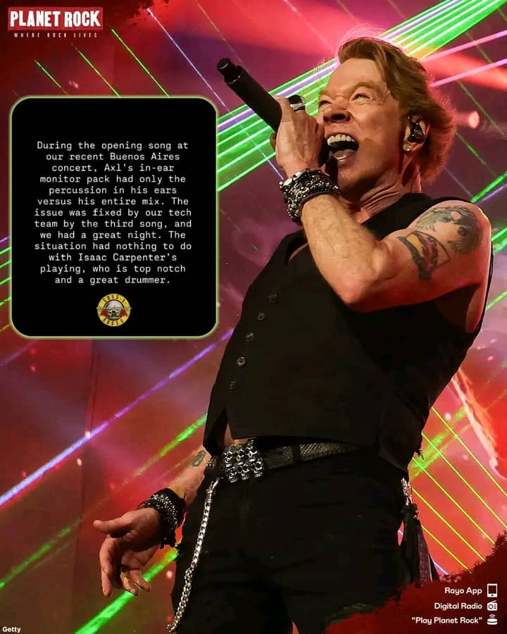 During the opening song at our recent Buenos Aires concert, Axl’s in-ear monitor pack had only the percussion in his ears versus the entire mix.”