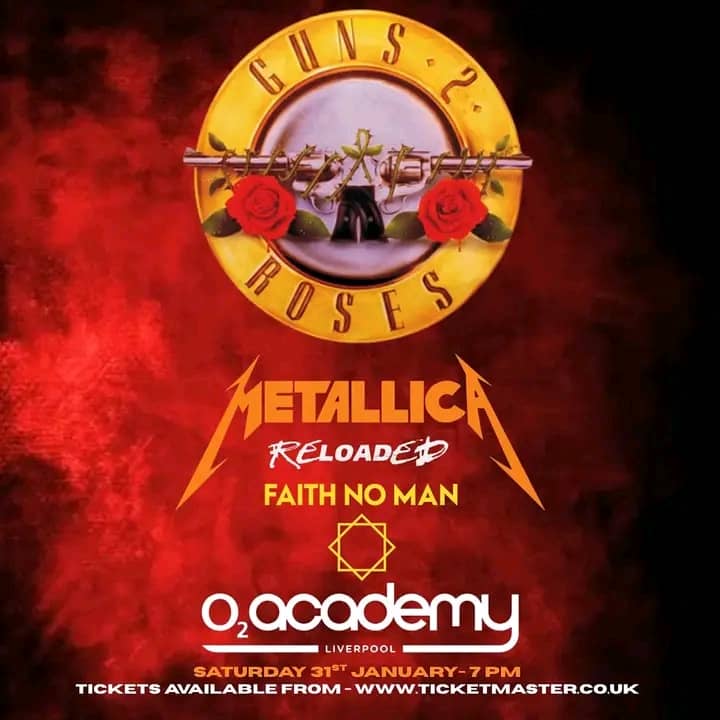 Liverpool, get ready because on January 31st, the O2 Academy will be transformed into the loudest, wildest, most unapologetically high-voltage rock sanctuary the city has seen in years. Three of the UK’s most explosive tribute bands Guns 2 Roses, Metallica Reloaded, and Faith No Man are taking over the stage for one unforgettable night that promises to shake the walls, melt faces, and deliver a full-force blast of pure rock nostalgia.