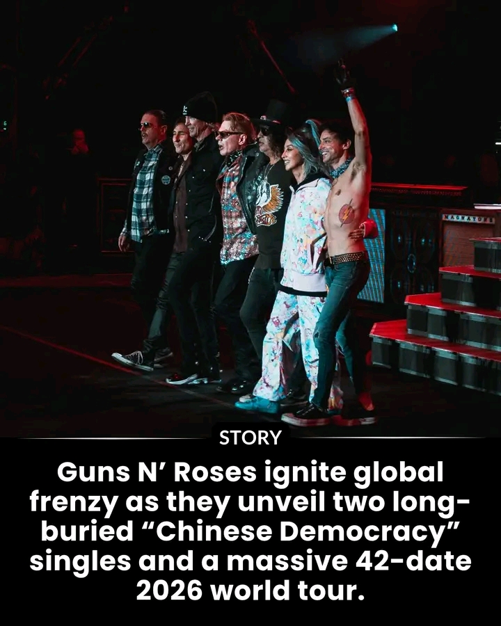Guns N’ Roses fans, buckle up because 2026 is already shaping up to be one of the most explosive years in the band’s post-reunion era. After months of cryptic hints, subtle leaks, and fan speculation spiraling out of control, the legendary rock giants have finally confirmed what almost no one believed would actually happen: two newly unearthed singles from the Chinese Democracy vaults are about to drop and they’re launching alongside a massive 42-date world tour that spans four continents and promises to be the band’s most ambitious run in over a decade.