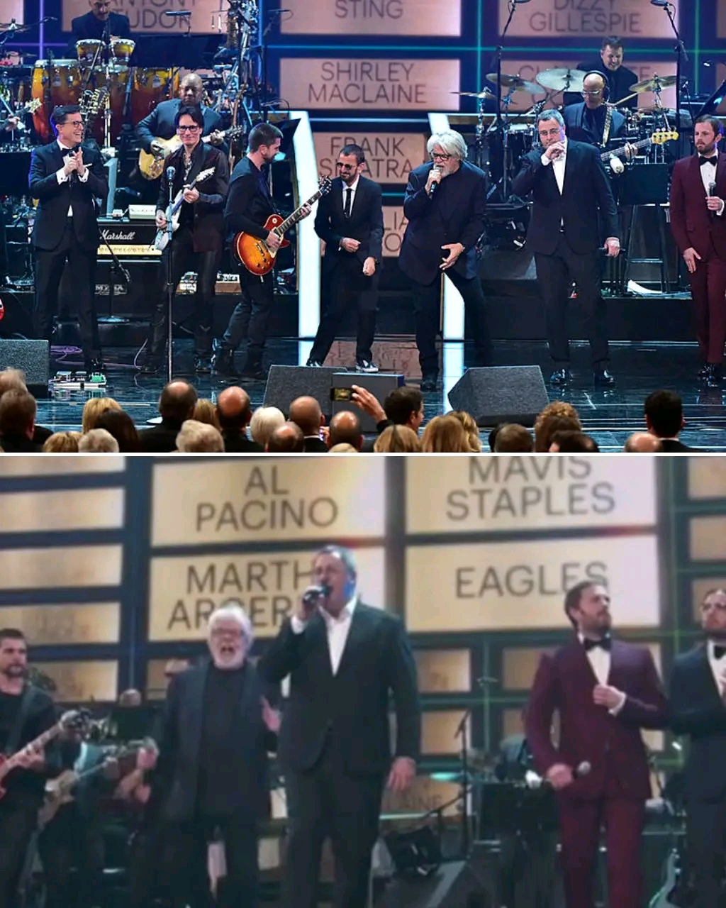 The tribute began with the familiar shimmer of guitars. The stage glowed a warm, sunset gold, a color that felt like California and heartbreak and open roads all at once. Rock legends took their places faces that shaped entire eras ready to honor a band that had shaped theirs.