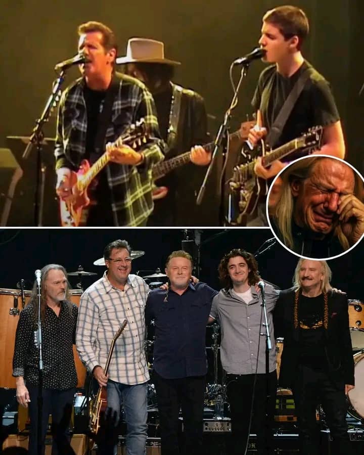 The arena held its breath as Deacon Frey stepped forward alone, guitar resting against his chest, thousands of fans silently asking the same question—could the son of Glenn Frey possibly carry a voice that defined generations—and then the first line of Peaceful Easy Feeling floated out, warm and unmistakable, sending gasps rippling through the crowd as tears appeared and hands reached for loved ones, because for a few suspended seconds it felt as if Glenn himself had walked back onto the stage, standing once more beside Don Henley, Joe Walsh, Timothy B. Schmit, and Vince Gill, not as a replacement but as family, proving that legacy isn’t about filling shoes—it’s about blood, memory, and a voice strong enough to carry love forward when the original singer is gone…