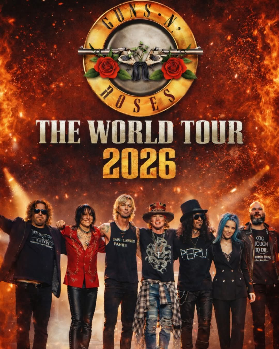 After years of partial reunions, rotating lineups, quiet reconciliations, and loud denials, seven members of Guns N’ Roses are officially standing together on one stage for “THE WORLD TOUR 2026.” And in a move no one saw coming, a portion of the tour’s proceeds will be directed to charitable causes, transforming one of rock’s most defiant legacies into something unexpectedly generous.