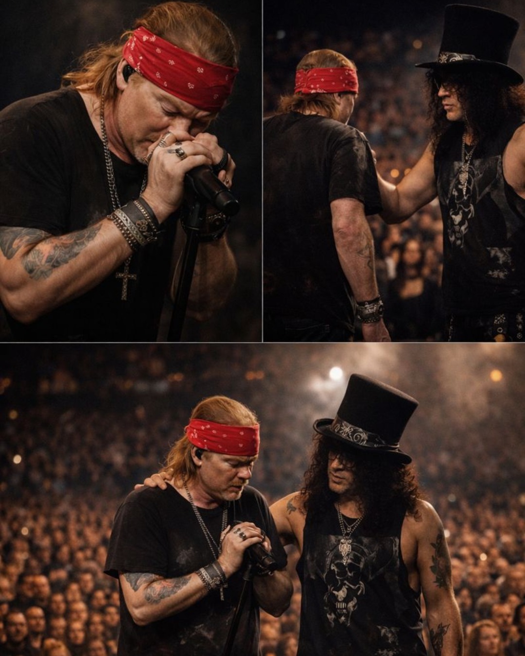 Instead, Slash walked straight toward Axl Rose the man he’d fought with, broken from, reunited with, survived history alongside. He stopped beside him, close enough that only Axl could see him clearly.