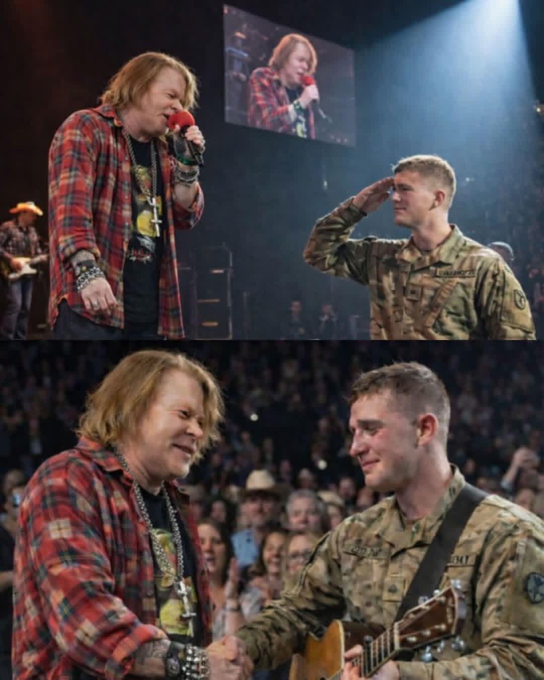 After a long pause, Axl finally nodded, squeezed the soldier’s hand once more, and gently guided him back toward the crowd. The band picked up the song again, but the energy had changed.