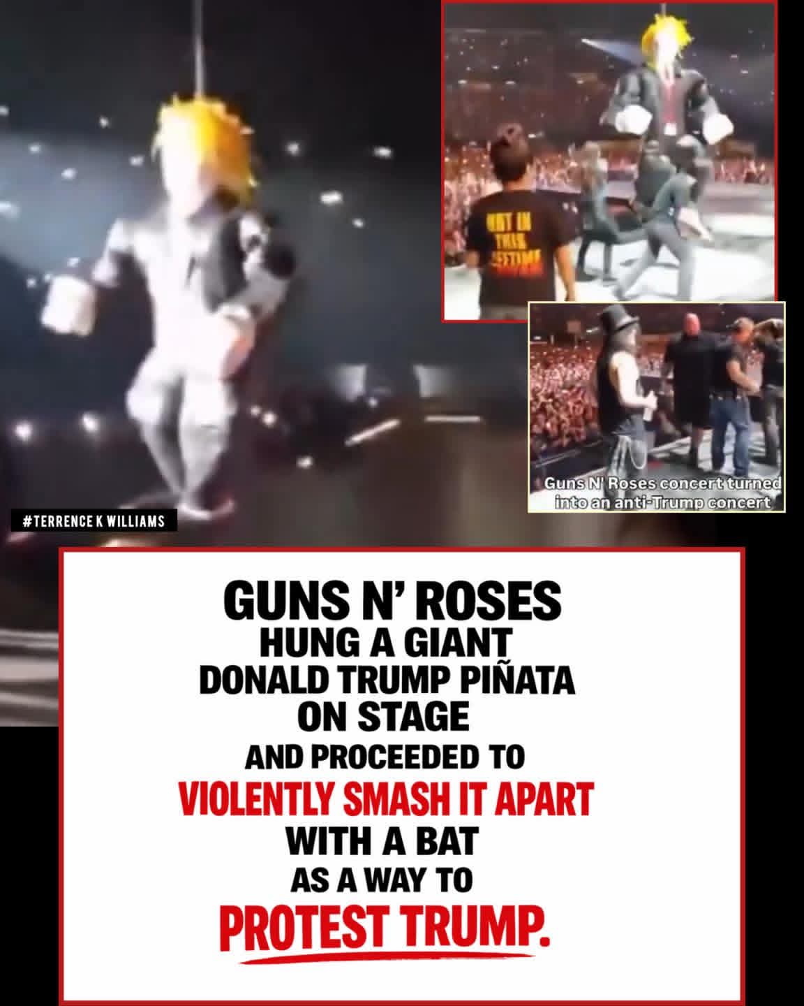BEAT IT: Guns N’ Roses hung a giant Trump piñata on stage and proceeded to beat it and smash it apart with a bat as a protest against Trump — in front of thousands of fans at their concert The music group is fine with Trump supporters not coming to their concerts….