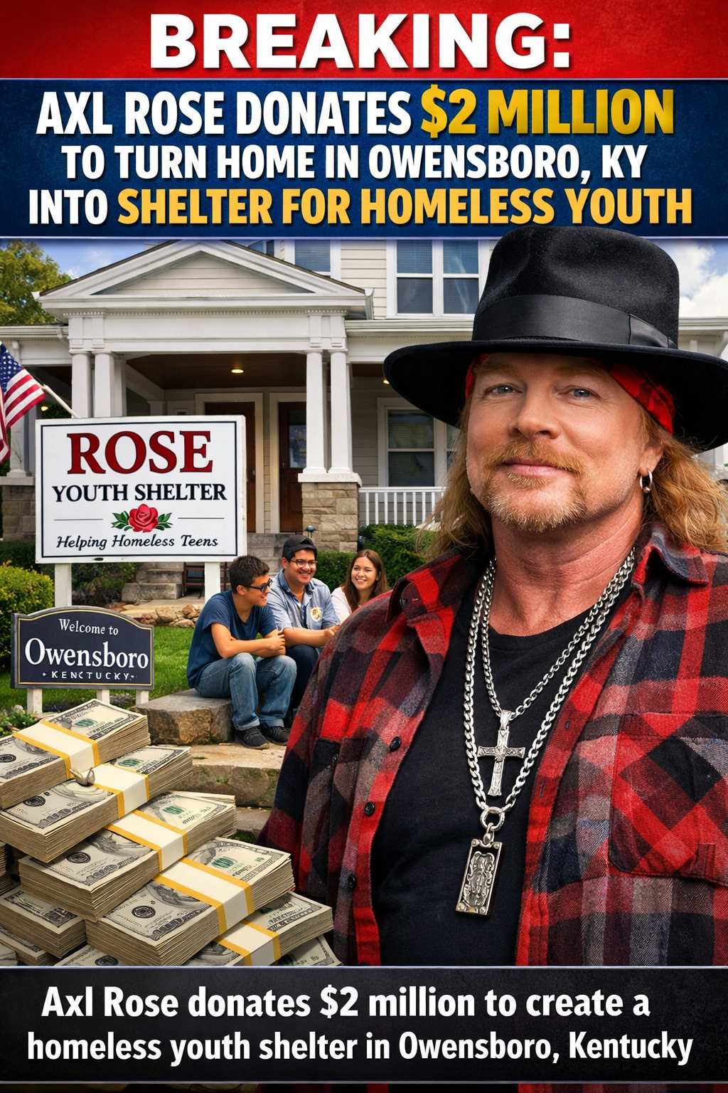 In a stunning act of generosity that no one saw coming, Axl Rose has donated a jaw-dropping $2 million to convert a home in his hometown of Owensboro into a shelter for homeless youth and fans are calling it the most powerful chapter of his life yet.