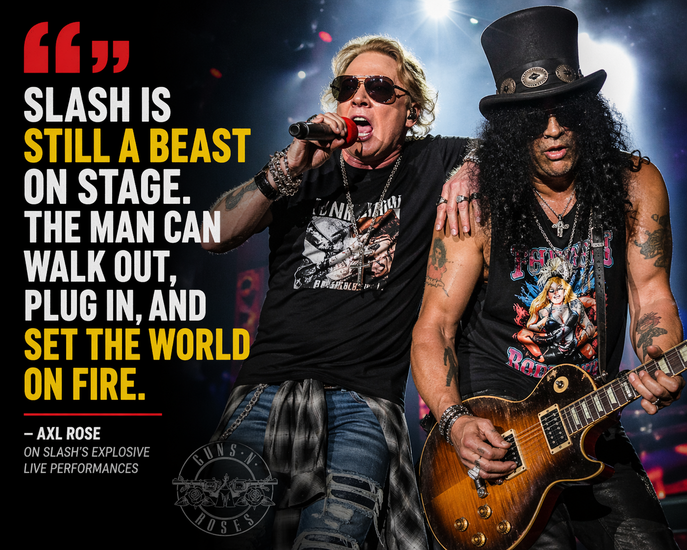 And let’s be honest: this isn’t just hype. Anyone who has seen Slash live in recent years knows exactly what Axl is talking about. From the opening riff to the final encore, Slash commands the stage with a presence that feels almost supernatural. His signature top hat, his Gibson Les Paul slung low, and that unmistakable tone it’s a combination that hasn’t lost a single ounce of its power.