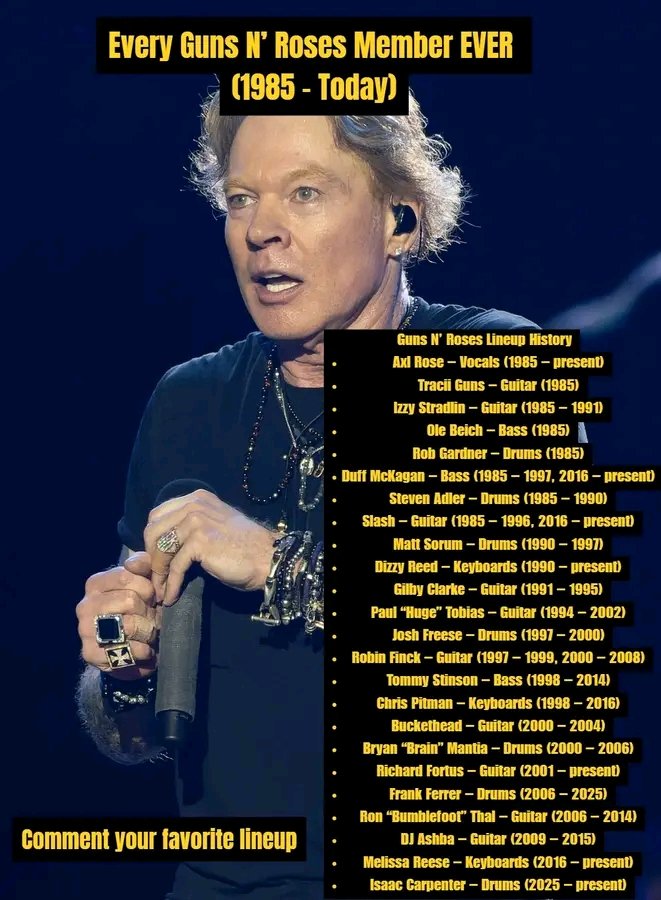 At the center of it all stands Axl Rose, the only constant since the band’s formation in 1985. But the story of Guns N’ Roses is far bigger than one man it’s a rotating cast of legendary musicians who helped shape the band’s sound, identity, and legacy.