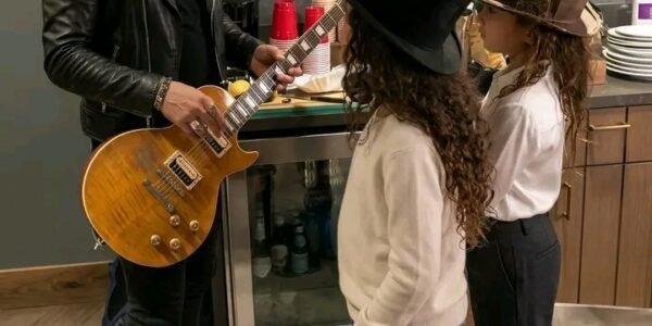 A shocking announcement Slash shares a relaxed, behind-the-scenes moment, showing his guitar to two kids dressed in his iconic style….